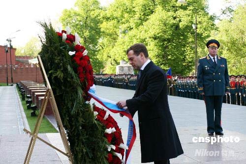 俄羅斯新任總統(tǒng)梅德韋杰夫來到克里姆林宮西北側(cè)紅墻下的亞歷山大花園,向無名烈士墓敬獻(xiàn)花圈,紀(jì)念衛(wèi)國戰(zhàn)爭勝利63周年。這是梅德韋杰夫就任總統(tǒng)后的首場(chǎng)正式活動(dòng)。中新社發(fā) 田冰 攝
