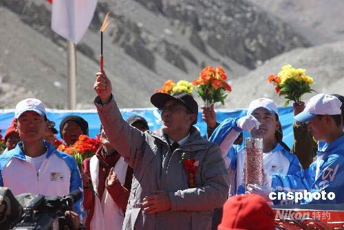 西藏自治區(qū)政府主席向巴平措用點(diǎn)火棒從珠峰火種燈中引燃圣火。 中新社發(fā) 盛佳鵬 攝