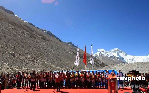 北京奧運(yùn)火炬接力珠峰傳遞中國登山隊(duì)凱旋慶祝儀式在珠峰大本營舉行。中新社發(fā) 盛佳鵬 攝