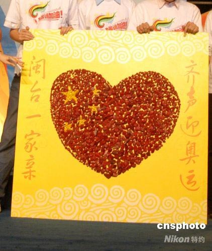 5月11日,臺灣學子在展示為奧運會創(chuàng)作的祝福禮物。中新社發(fā) 張 斌 攝