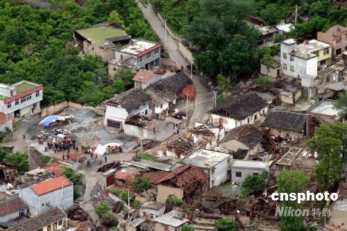 5月14日,空中拍攝的汶川縣城一角。成都軍區(qū)某陸航團(tuán)四架直升機滿載帳篷、礦泉水等災(zāi)區(qū)急需物資抵達(dá)四川大地震震中汶川縣,并在返回時將第一批40名重傷員隨機送抵成都的醫(yī)院救治。中新社發(fā) 張雷 黃龍 攝