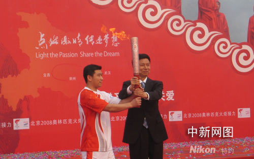 六月二日上午八時(shí)十二分,北京奧運(yùn)會火炬接力荊州傳遞開始,該市傳遞路線全長為十八點(diǎn)八公里。圖為體操奧運(yùn)冠軍鄭李輝從中共荊州市委書記應(yīng)代明手中接過火炬開始第一棒傳遞。 中新社發(fā) 艾啟平 攝