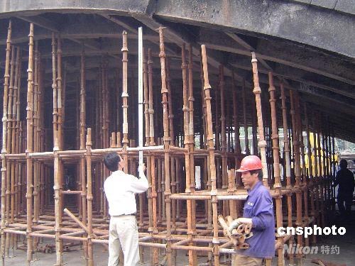 因小商品攤位發(fā)生火災導致南京長江大橋南引橋第一橋孔受損嚴重,有關(guān)方面正組織力量抓緊搶修加固,工程完成需時二個多月。中新社發(fā) 王國安 攝