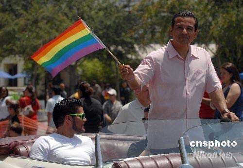 洛杉磯市長維拉萊格薩揮舞彩虹旗參加同性戀者大游行,以示支持。中新社發(fā) 張煒 攝