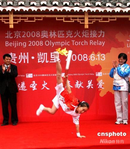6月13日,奧運火炬在貴州省黔東南苗族侗族自治洲傳遞,第一棒火炬手、體操運動員林麗接過火炬后,做起了精彩的體操動作,引得現場一片喝彩。 中新社發(fā) 周兆軍 攝