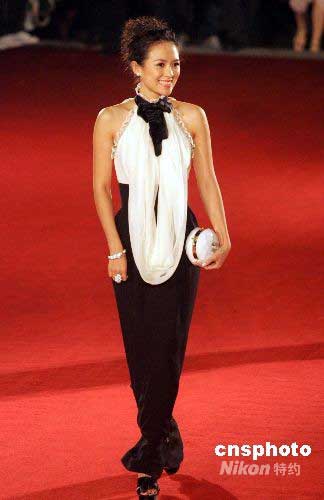 章子怡穿著上白下黑的長裙走上愛心大道,頭上別著水鉆的閃亮發(fā)飾,成為最亮麗明星。中新社發(fā) 潘索菲 攝
