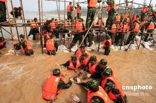 6月18日,山東省軍區(qū)和濟(jì)南警備區(qū)在濟(jì)南西郊玉清湖附近黃河大堤舉行大型防汛搶險演練。來自濟(jì)南市的10支民兵預(yù)備役部隊、黃河專業(yè)搶險隊等共1300余名隊員演練了水情偵察、封堵決口、爆破分洪、管涌搶護(hù)、堤壩搶護(hù)、緊急營救、搶筑子堤等七項防汛搶險科目。中新社發(fā) 周青先 攝