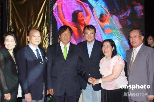 臺(tái)灣“立委”周守訓(xùn)(右三)前來向《明報(bào)》企業(yè)集團(tuán)董事主席張曉卿(左三)表示祝賀。中新社發(fā) 耿軍 攝
