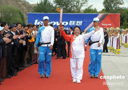 6月21日,奧運(yùn)圣火在西藏拉薩進(jìn)行傳遞,著名藏族老歌唱家才旦卓瑪高擎“祥云”火炬在布達(dá)拉宮廣場跑向終點(diǎn)。 中新社發(fā) 廖攀 攝