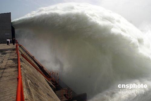 2008年6月23日,黃河小浪底水庫大流量下泄,再現(xiàn)飛瀑景觀。黃河第七次調(diào)水調(diào)沙2008年6月19日啟動以來,黃河小浪底水庫下泄流量逐步加大,通過小浪底水庫進(jìn)行人為控制,以水沙相協(xié)調(diào),對下游河道進(jìn)行沖刷,最終達(dá)到減少下游河道淤積的目的。中新社發(fā) 平白 攝