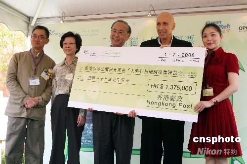 香港郵政將發(fā)售限量版大熊貓掌印及郵票珍藏紀(jì)念郵品籌得的一百三十多萬港幣轉(zhuǎn)贈給香港海洋公園保育基金,以支持重建四川大熊貓基地設(shè)施。中新社發(fā) 武仲林 攝