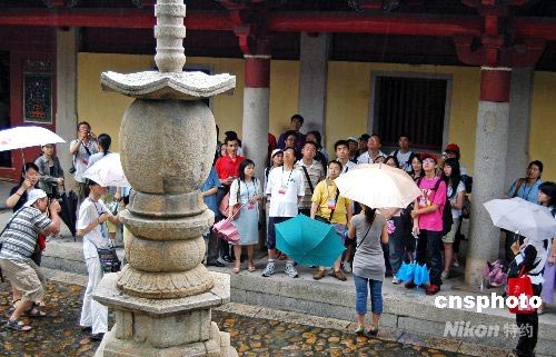 七月七日,參加海峽西岸二00八年臺胞青年夏令營的一百一十多名臺胞青年來到古城泉州,冒雨參觀建于唐朝開元年間、迄今已有一千二百多年歷史的開元寺。此次夏令營以“魅力海西、臺胞祖地”為主題,旨在讓兩岸青年在參觀歷史文化古跡、聆聽閩臺傳統(tǒng)文化講座、舉行聯(lián)歡活動中增進友誼和對福建的了解。中新社發(fā) 傅丹丹 攝