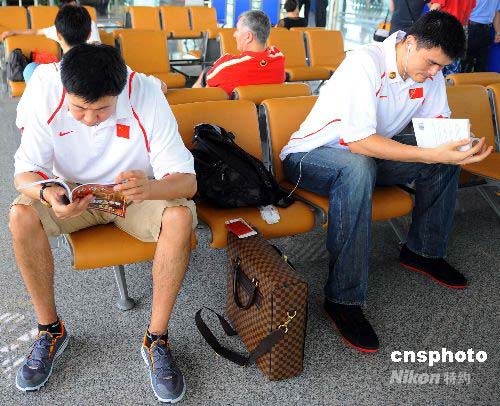 在北京機(jī)場(chǎng)候機(jī)時(shí),中國(guó)男籃的“擎天拄”姚明與王郅治看書消磨時(shí)光。中新社發(fā) 任晨鳴 攝