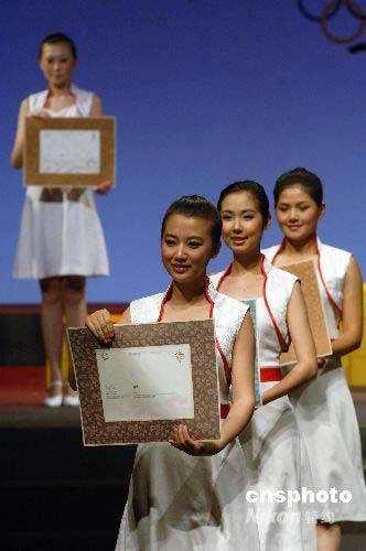 7月17日晚,北京奧運(yùn)頒獎(jiǎng)證書在北京正式發(fā)布。圖為奧運(yùn)禮儀志愿者展示證書。中新社發(fā) 王東明 攝