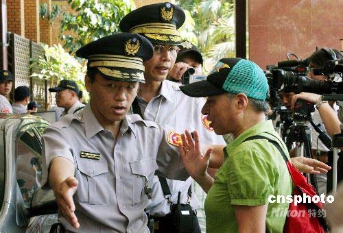 7月21日,臺(tái)灣前海軍中將雷學(xué)明等控告陳水扁等人誹謗案在臺(tái)北地方法院開(kāi)庭。這是是陳水扁卸任臺(tái)灣領(lǐng)導(dǎo)人后首度至法院出庭,創(chuàng)下卸任領(lǐng)導(dǎo)人以被告出庭的首例。為此,大批警方出動(dòng)維持秩序,不過(guò)仍發(fā)生陳水扁上午在步入法院時(shí)遭一民眾踹一腳的意外。圖為警方在法院門(mén)口勸離一民眾。中新社發(fā) 黃少華 攝