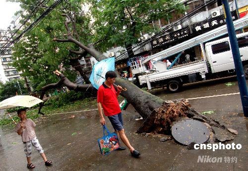7月28日,受臺(tái)風(fēng)“鳳凰”影響,福州市區(qū)普降大雨,一棵大榕樹被連根拔起,阻礙路面交通。福建省氣象臺(tái)預(yù)計(jì)強(qiáng)臺(tái)風(fēng)“鳳凰”可能于28日上半夜在福建連江到廈門之間沿海再次登陸。中新社發(fā) 劉可耕 攝