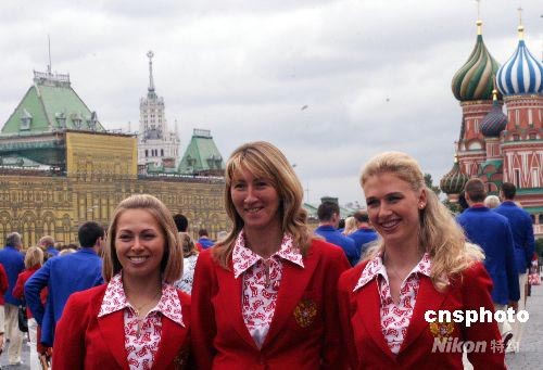 7月29日,俄羅斯總統梅德韋杰夫在克里姆林宮為參加北京奧運會的俄羅斯代表團舉行送行儀式,鼓勵本國運動員爭創(chuàng)佳績。俄羅斯奧運代表團將于近日陸續(xù)抵達北京。圖為身穿奧運禮服的俄羅斯女運動員在紅場留影。 中新社發(fā) 田冰 攝