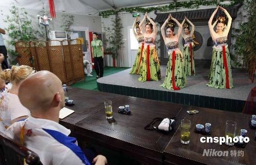 7月29日,在北京奧運(yùn)村的中國茶館里,剛剛訓(xùn)練完的英國跳水隊在這里品茶休息。奧運(yùn)村里完善的設(shè)施處處體現(xiàn)著濃濃的中國風(fēng)情。中新社發(fā) 杜洋 攝