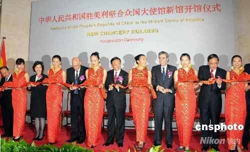 中國駐美大使館新館,當(dāng)?shù)貢r間七月二十九日傍晚舉行開館儀式,中美多名部長和各界名流千余人出席,圖為中國外長楊潔篪(中)、駐美大使周文重(右二)、常駐聯(lián)合國代表王光亞(左一)和美國財長保爾森(左五)、商務(wù)部長古鐵雷斯(右四)、勞工部長趙小蘭(左三)、常務(wù)副國務(wù)卿內(nèi)格羅蓬特、總統(tǒng)國家安全事務(wù)副助理杰弗里等等為新館開館剪彩。中新社發(fā) 邱江波 攝