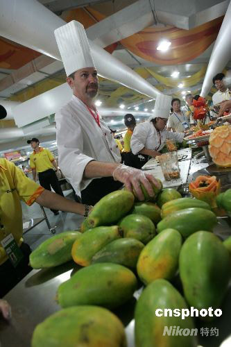 7月30日,北京奧運村的廚師在準(zhǔn)備新鮮水果。中新社發(fā) 杜洋 攝