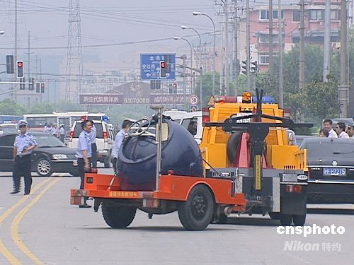 圖為上海警方啟用防爆裝置,把疑似爆炸物轉移。中新社發(fā) 宣克炅 攝