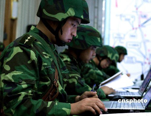 中國人民解放軍“勵兵--2008”演練8月26日拉開帷幕。當(dāng)日上午濟南軍區(qū)某機械化步兵旅指揮機關(guān)向所屬部隊下達了進入戰(zhàn)備狀態(tài)命令,部隊迅速進入戰(zhàn)位嚴整以待,戰(zhàn)備狀態(tài)將隨時升級。中新社發(fā) 宋吉河 攝