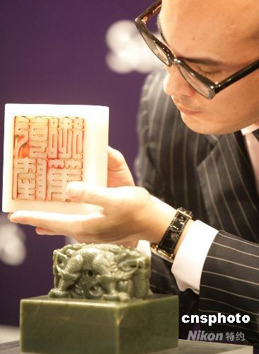 香港蘇富比拍賣行將于2008年10月8日舉行“中國(guó)瓷器及工藝品秋季拍賣會(huì)”,8月26日舉行媒體預(yù)展,圖為展示的乾隆帝御寶交龍鈕《乾隆御筆》白玉璽,預(yù)料成交價(jià)超過(guò)五千萬(wàn)港元。中新社發(fā) 張勤 攝