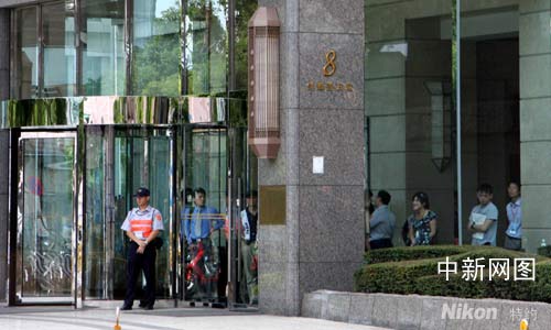 8月28日下午二時(shí)半至三時(shí),臺(tái)北市舉行“萬安演習(xí)”,街上行人凈空。圖為臺(tái)北市新光人壽曼哈頓世貿(mào)大樓。警察正守在大門口,民眾只能呆在樓內(nèi)。等待演習(xí)完再出街。攝影 陳立宇