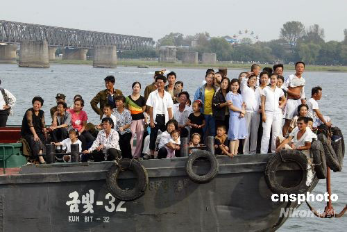 9月9日正值朝鮮國(guó)慶,朝鮮新義洲民眾有組織地乘船游覽鴨綠江。中新社發(fā) 陳浩浩 攝
