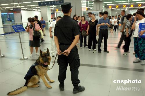 9月10日,北京2008年殘奧會(huì)正在進(jìn)行之中,北京市公安局公交總隊(duì)派出了公交警犬在10號(hào)線巡邏執(zhí)勤,檢查易燃易爆物品。圖為大批去奧林匹克公園看殘奧會(huì)和參觀的乘客駐足觀看執(zhí)勤的警員和公交警犬。中新社發(fā) 鄒憲 攝
