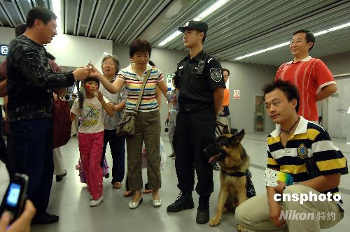 大批去奧林匹克公園的乘客即興與警員和公交警犬合影留念。 中新社發(fā) 鄒憲 攝