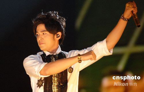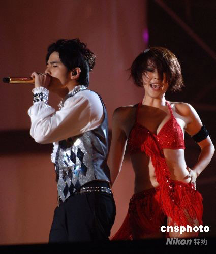 9月20日19時(shí)30分,“2008周杰倫世界巡回演唱會(huì)”在西安陜西省體育場(chǎng)演出。周杰倫在演唱會(huì)上大秀“奧運(yùn)加油操”。中新社發(fā) 李海軍 攝