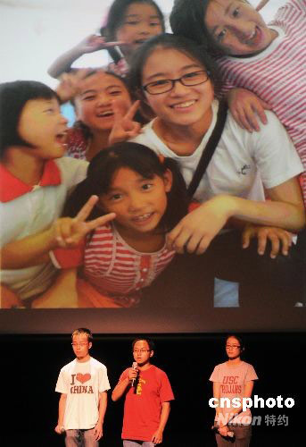 當(dāng)?shù)貢r(shí)間9月20日晚,來自美國西南各地的數(shù)百名中國留學(xué)生和學(xué)者代表在洛杉磯南加州大學(xué)歡聚一堂,舉行“夢圓中華”中秋國慶晚會(huì),迎接中華人民共和國成立59周年。圖為留學(xué)生代表在晚會(huì)上講述暑期赴四川地震災(zāi)區(qū)從事志愿活動(dòng)的經(jīng)歷。中新社發(fā) 張煒 攝