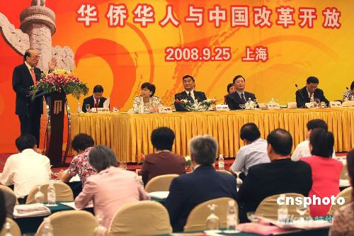 9月25日,中國僑聯(lián)主辦的“華僑華人與中國改革開放紀念大會”在上海舉行,來自20多個國家和地區(qū)的300余名僑領(lǐng)、華商共聚一堂,圍繞“華僑華人與中國改革開放”主題,共敘中國改革開放30年取得的偉大成果。中新社發(fā) 史利 攝