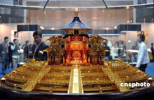 十月十四日,鑲有約20萬粒寶石的“天壇祈年殿”工藝品引人注目。這件作品高1.38米,重2.5噸,以金銀、寶石等材料制成。當(dāng)日,中國(guó)傳統(tǒng)工藝美術(shù)精品大展在北京民族文化宮舉行,該展集中展現(xiàn)了改革開放以來中國(guó)工藝美術(shù)三十年發(fā)展成就。中新社發(fā) 廖攀 攝