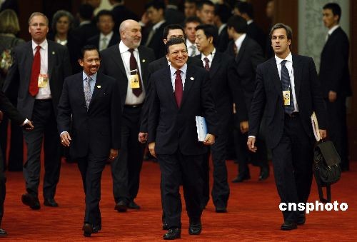 歐盟委員會主席巴羅佐(中)出席會議。中新社發(fā) 盛佳鵬 攝