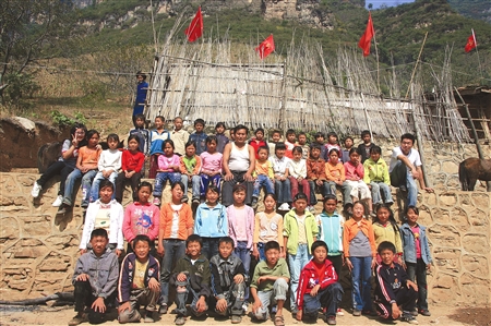 志愿者走前,拿著志愿者送來的從未使用過的彩色筆,孩子們興奮地在白布上畫畫寫字,秩序有點亂。申其軍用方言大吼了一聲,隊伍立即整齊了。“還是申老師鎮(zhèn)得住這些娃娃!币慌缘拇迕裥χf。申其軍站在包唐韜和楊菲旁,微微露出滿意的笑容:“包老師和楊老師,他們會離開這里,我心里很清楚。我希望有更多的志愿者來幫助這些孩子!