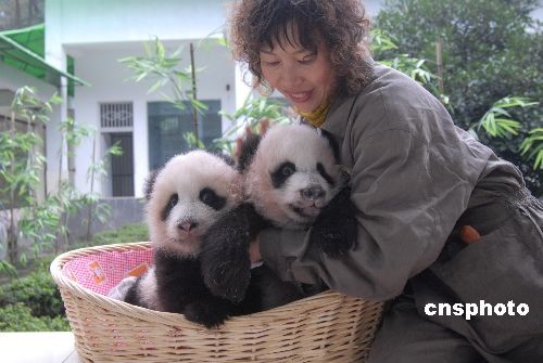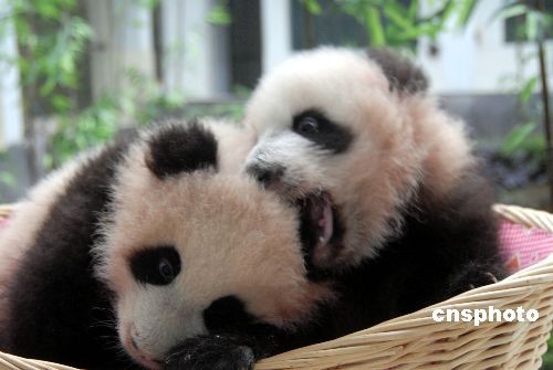 5.12汶川大地震發(fā)生時(shí),大熊貓“幗幗”已經(jīng)懷孕110余天,5月24日“幗幗”被安全轉(zhuǎn)移至碧峰峽基地,7月6日“幗幗”順利產(chǎn)下一對龍鳳胎。這對龍鳳胎大熊貓成為2008年出生的全球首對大熊貓雙胞胎。為給這對不平凡的熊貓寶寶取一個(gè)有意義的名字,中國保護(hù)大熊貓研究中心聯(lián)合網(wǎng)絡(luò)媒體一起發(fā)起 “2008全球首對大熊貓雙胞胎征名活動(dòng)”。10月下旬,中國保護(hù)大熊貓研究中心雅安碧峰峽基地歌聲飛揚(yáng)——2008年全球首對大熊貓雙胞胎百日慶典活動(dòng)隆重舉行;同時(shí)大熊貓研究中心向全球公布了網(wǎng)上投票選出的 “平平”“安安”兩個(gè)熊貓幼仔乳名。中新社發(fā) 羅小韻 攝