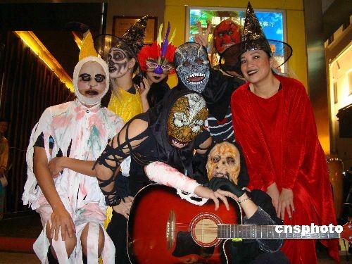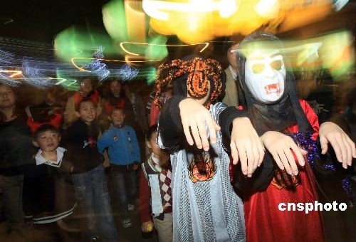 10月31日晚,蘇州宮巷一商家請來一群裝扮成“妖魔鬼怪”的演員在店門前表演節(jié)目,歡慶“萬圣節(jié)”。中新社發(fā) 王建康 攝