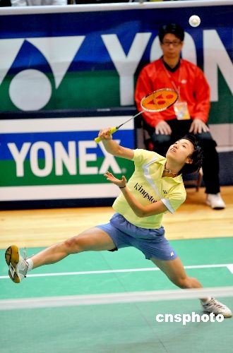 中國(guó)香港選手葉姵延在香港伊利沙伯體育館舉行的二零零八香港公開羽毛球超級(jí)賽首輪比賽中,以二比零戰(zhàn)勝荷蘭選手姚潔,晉級(jí)十六強(qiáng)。中新社發(fā) 鄧慶樂 攝