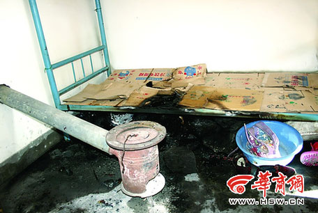 宿舍里放著一個(gè)爐子,煙囪在距地面30厘米處,爐子?xùn)|邊床鋪下就堆放著煤塊,床板已被點(diǎn)燃,被子也被燒了,幾雙鞋子也沒來得及穿上,散落在宿舍里。