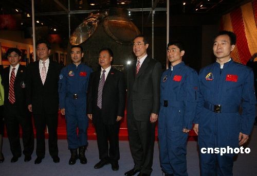 圖為香港政務(wù)司司長唐英年、神舟七號載人航天飛行赴港代表團(tuán)團(tuán)長暨中國載人航天工程副總指揮張建啟、神七航天員翟志剛、劉伯明、景海鵬等在返回艙前合影。中新社發(fā) 武仲林 攝