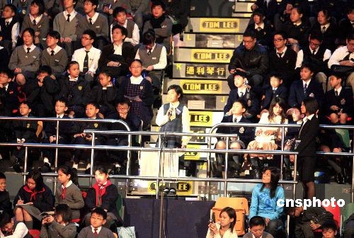 圖為中國載人航天工程辦公室主任及副團(tuán)長王文寶及三位航天員與香港學(xué)生真情對話現(xiàn)場,臺下的學(xué)生正在提問。中新社發(fā) 張勤 攝