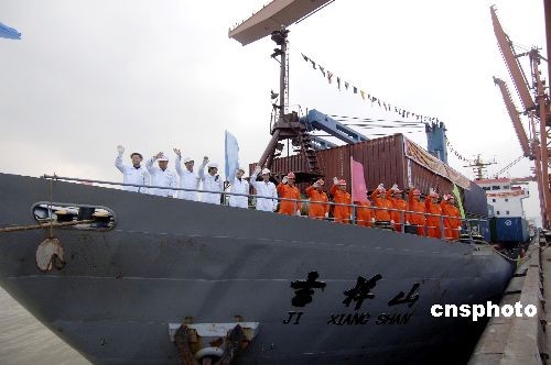 承擔(dān)閩臺海上貨運(yùn)直航首航任務(wù)的“吉祥山”號船員與送行人員揮手告別。中新社發(fā) 王東明 攝