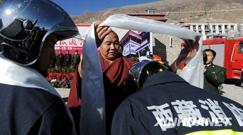 12月15日,西藏拉薩哲蚌寺僧人向寺院消防大隊(duì)官兵敬獻(xiàn)哈達(dá)。 格桑達(dá)瓦 攝