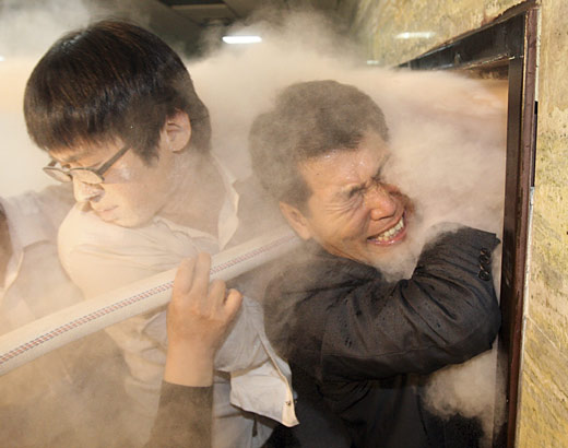 韓國(guó)執(zhí)政黨議員使用滅火器阻止在野黨人士進(jìn)入會(huì)議室。
