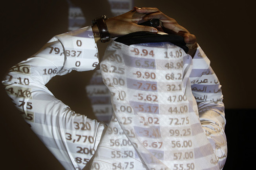 沙特商人在股市大屏幕前,投影在它身上的數(shù)字是一片紅色。