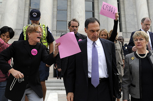 信貸緊縮雷曼破產(chǎn),首席執(zhí)行官 Richard S. Fuld 無(wú)奈面對(duì)抗議人。