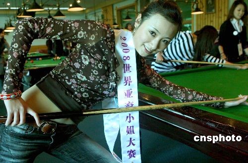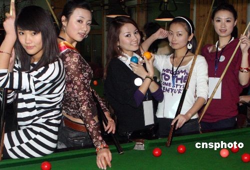 12月23日,正在北京參加2008世界亞裔小姐大賽中國(guó)區(qū)總決賽的佳麗在嘉年華游樂園游覽拍照,各種游樂項(xiàng)目吸引佳麗。圖為參賽佳麗練習(xí)打臺(tái)球。中新社發(fā) 錢興強(qiáng) 攝