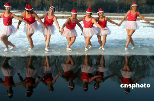 在中國(guó)吉林,圣誕老人雪地里跳天鵝湖。